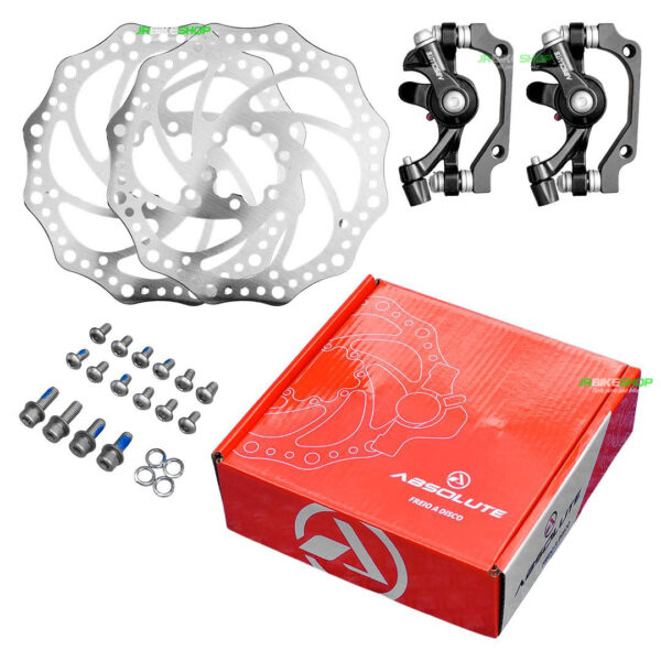 Freio à Disco Mecânico Absolute Dianteiro/Traseiro Obtenha frenagens de qualidade com um excelente custo x benefício com o Par de Freios à Disco Absolute TD01 – Mecânico. Fabricados em alumínio, proporciona leveza e durabilidade contra impactos, atritos e corrosões, mantendo elevada a qualidade para encarar o uso urbano e os passeios e treinos de mountain bike. Contando com o conjunto de rotores (disco de freio) e pinças, o Freio à Disco Mecânico Absolute TD01 possui furação pra encaixe em cubos de rodas com sistema de 6 furos, garantindo muito mais segurança para o uso nas cidades ou no mtb de entrada. Especificações Freio à Disco Mecânico Absolute TD01 Praticidade para a instalação – contém o sistema de freios (pinças e rotores) para maior personalização de cada ciclista Compatível com cubos de rodas com 6 furos – segurança na fixação junto aos cubos com melhor custo x benefício Fabricação em alumínio – mais leveza e resistência contra impactos, corrosões e atritos Peso seco aproximado (conjunto): 668 gramas *Compatível com cubos de rodas padrão 6 furos. Cada embalagem contém: 02 Pinças de freio com pastilhas já instaladas 02 Rotores (discos de freio) de 160mm cada 01 Pacote com parafusos para instalação *Não contém cabos e manetes *Consulte seu mecânico sobre a compatibilidade e para realizar a instalação das peças, assim você garante toda a qualidade e eficiência do produto.