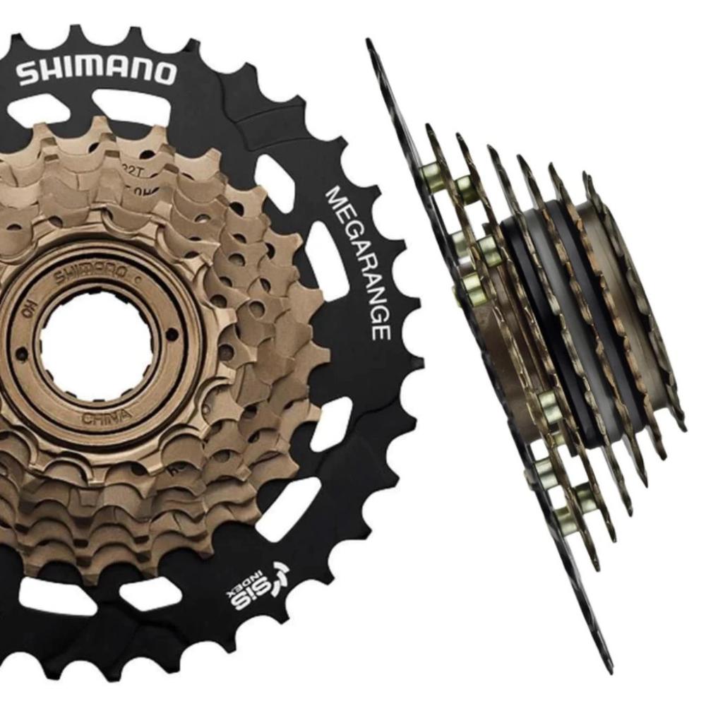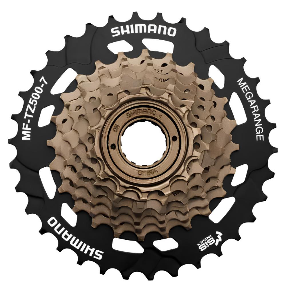 Catraca Roda Livre Megarange Shimano Tourney MF-TZ500-7 para bicicletas com relação de 7 velocidades. Esta catraca vem com a tampa feita em aço e as engrenagens em aço carbono, além de possuir coroas de 14, 16, 18, 20, 22, 24 e 34 dentes. Esta catraca segue o padrão de rosca para o encaixe e vem com o sistema index. Ela é compatível com cubos de rosca e com relação de 21 velocidades. Tudo isso com a qualidade Shimano!